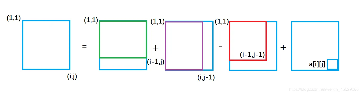 通过图片可知,sum[i][j]=sum[i-1][j]+sum[i][j-1]-sum[i-1][j-1]+a[i][j]