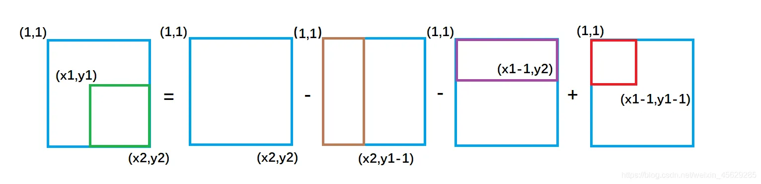 不难推出,s[x2, y2] - s[x1 - 1, y2] - s[x2, y1 - 1] + s[x1 - 1, y1 - 1]